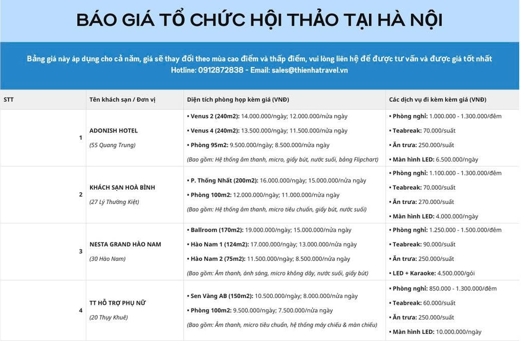 Công ty TNHH tư vấn đầu tư và du lịch quốc tế Thiên Hà xin gửi tới quý khách hàng báo giá tổ chức hội thảo tại Hà Nội. Bảng giá này áp dụng cho cả năm, giá sẽ thay đổi theo mùa cao điểm và thấp điểm, vui lòng liên hệ để được tư vấn và được giá tốt nhất Hotline: 0912872838 - Email: sales@thienhatravel.vn